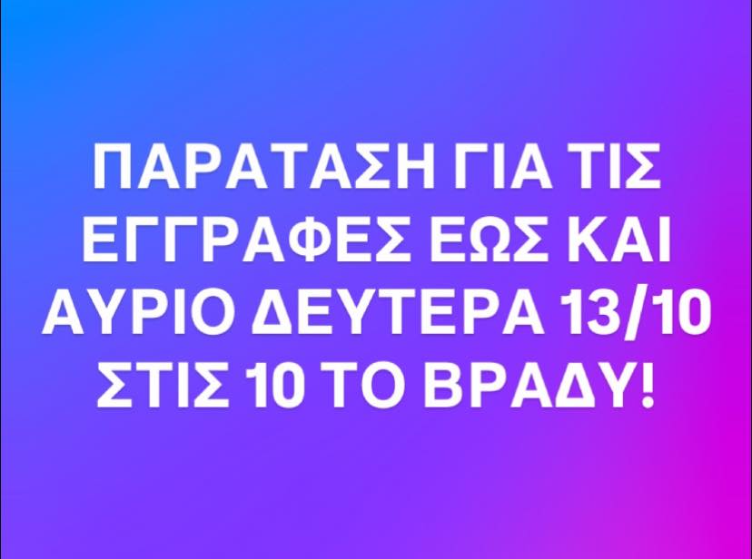 Σας ενημερώνουμε ότι λόγω μεγάλης ζήτησης δόθηκε παράταση στις εγγραφές έως και αύριο Δευτέρα 13/10 στις 10 το βράδυ!!!